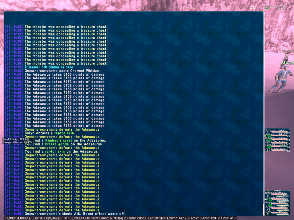 Bahamut.Dannyl said: » Hey OMG, In terms of a pulling set, I've been playing with it lately so mine may not be ideal , yet. I originally focused on -50% PDT, which is very capable, especially with Atma of Lion, however, I now started to get more Evasion into the mix. Here's what I use: *Dark Rings are -5% and -6% PDT There are a few things you can do to upgrade or even replace. For now, this works for me. If you'd like I post my spell-list that I use for burning, but I'll need to go home to post that. Edit: Atma of MM or not, is purely the users preference and comfortably. When I didn't have Ultimate, I used MM, even without MM over Ultimate, I don't have a problem with MP. Through temps, ISL's and my Idle Refresh set, its never an issue. Ahh this is gooood, tonight I'll be farming time so I'm definitely gonna take everyones feedback into consideration! woohoo, I shall let you guys know the results and maybe a few ss's to see if we can critique for improvement. Thnx guys! Sylph.Decimus said: » For Whirl Aqua Rings should offer the same increase in modifiers at a fraction of the cost. And Pyrosoul has mnd -3 so you net less in modifiers STR has the added benefit of adding Blue Magic Attack. Okay Guys I'm in the midst of farming time as we speak and this was a quick SS I took with my strategy..I tried Kaht's way but some reason I died instantly.. my WoR was only doing 1.2-1.5k and then CW was 4k or less.. So I just stayed with my strategy for the friendly event til I can figure out what I'm doing wrong. :)