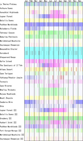 When it comes to fire weather, you just have to grin and bear it. Here's a weather chart that was recorded over the span of a vana'diel year. Notice the lack of red lines on the chart. Fire weather just barely shows up, anywhere. You'd think with the deserts and volcanos that exist in this game that there'd be a location with frequent fire weather, but such is not the case.