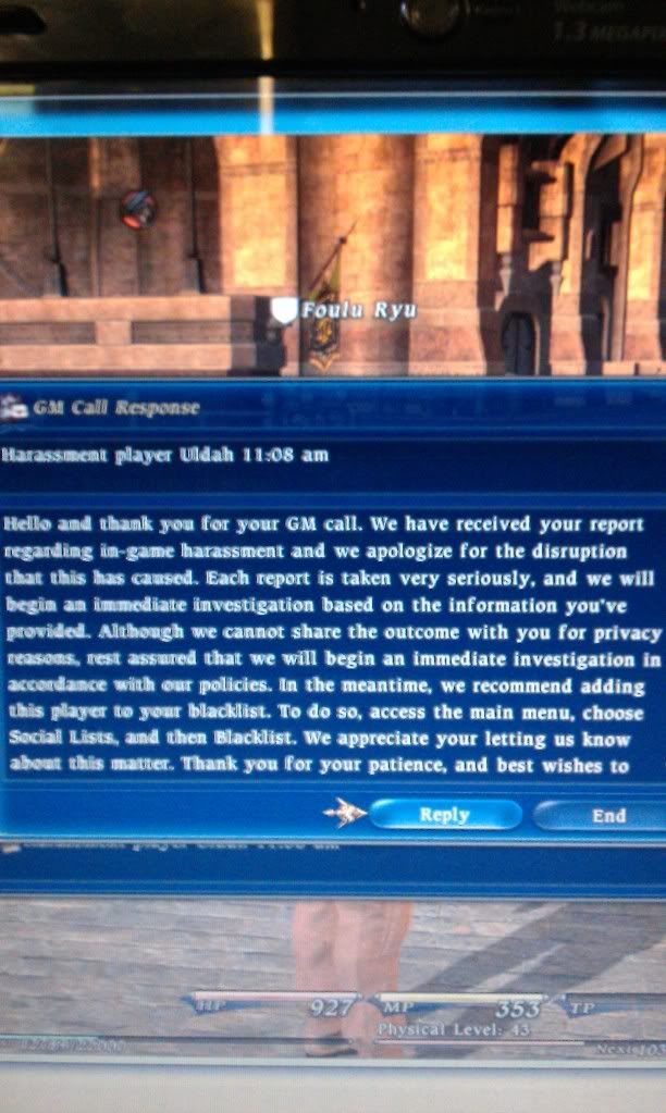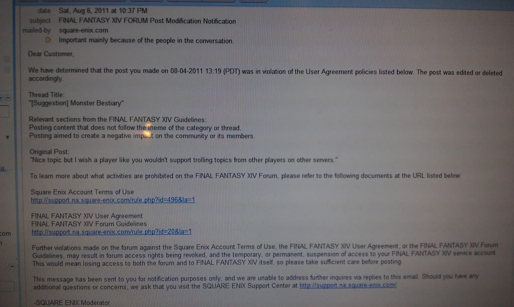 Problem here is, if you're in a disagreement of a post on the lodestone forum and if it sounds like something 'offensive' or enough trolls of their own friends to complain they are reporting you for fun. I know this might not seem important but we need GMs to do their job. I've submitted my feed back and a detailed situation with in game behavior activities. What really bothers me there are some posts of the trolls on there in their posting history is little to none have been deleted on harsh comments.