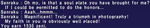 As an adjustment to the time required for both creating and enhancing Mythic weapons, we are trying to increase the amount of zeni received for each soulplate traded, so you receive over 10 times the amount. (Currently on the test server the data has been changed so you receive 15 times as much)