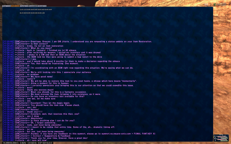 But next time bigger screenshot please, I lost 2 degrees of eyesight reading that chatlog. Fenrir.Greever said: » Hello everyone, I orignally started this thread a few months back I want to just give an update. I just happened to call a gm to get an update on it since i didnt try contacting them since it happened. after a breif conversation, GM Jitorio gave me the good news that i would be getting my Almace back. and in less then 5 min i had it back in my inventory! Epic win, this restores some of my lost faith in humanity, and GMs. I like how the GM said he meant to be visible. XD