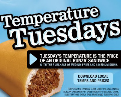 Ramuh.Rowland said: I'm getting me some Runza after work! Buy fries and a drink and get a Runza for whatever the temperature was at 6am this morning. So that means I pay like $3 for fries and drink, pay another 14cents for a runza.